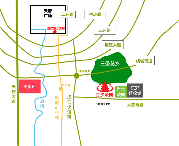 距離天府廣場約10公里,是成都市區內規模大、環境好、服務優、管理強的藝術化、生態化、現代化的公園式陵園。